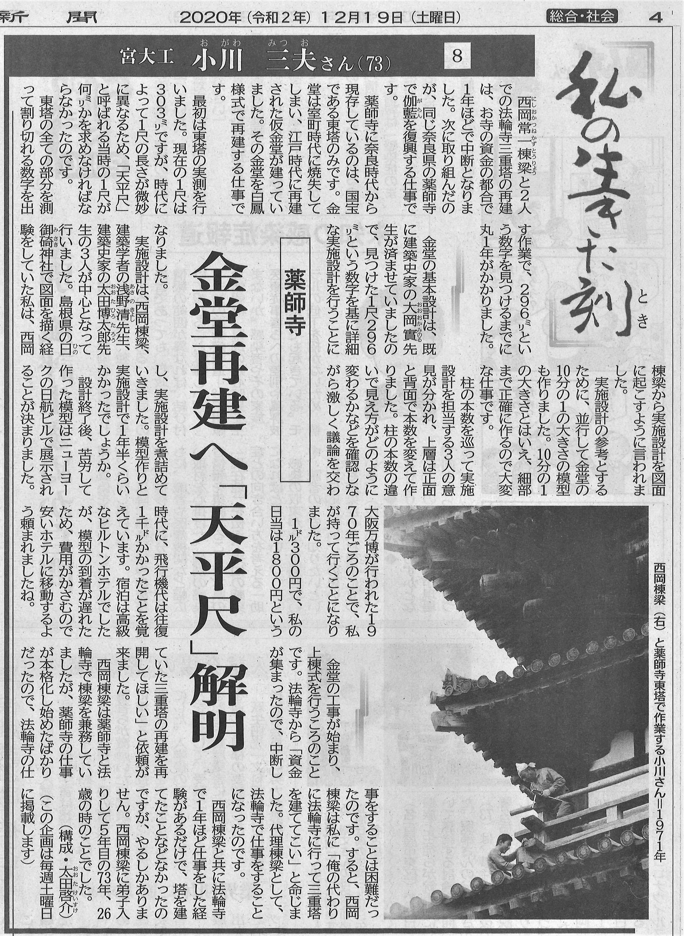「私の生きた刻」 宮大工 小川三夫氏の連載(毎週土曜日)の8回目です。(下野新聞12月19日(