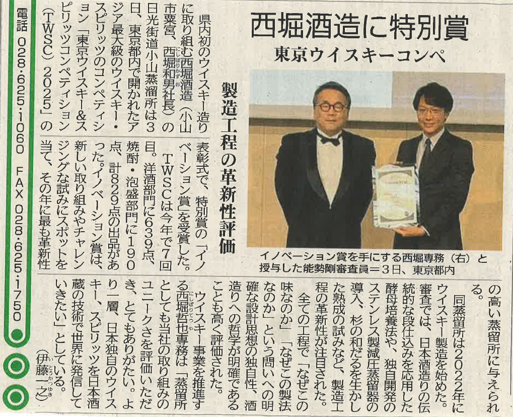 下野新聞にて、【東京ウィスキー&スピリッツコンペティション2025】で小山市の 西堀酒造株式会社様 が特別賞「イノベーション賞」を受賞されたという記事が掲載されていました。心よりお祝い申し上げます。